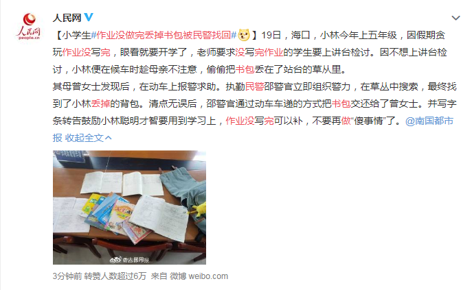 为了逃避开学被老师惩罚,海口一小学生直接把书包扔了。