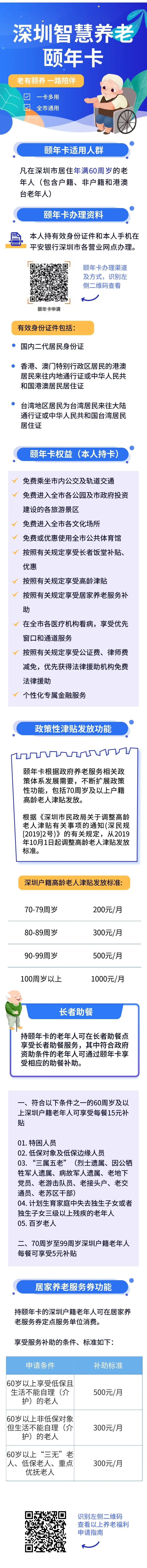 据悉,凡在深圳市居住年满60周岁以上的老年人(包含港澳台老年人),均可持有效身份证件和手机申请办理。“颐年卡”持卡人,可享受敬老优待,包括免费进入全市各公园,免费进入市政府投资建设各旅游景区,免费乘坐市内公交车和轨道交通。70周岁及以上户籍老人还可享受高龄津贴发放;符合规定的户籍老年人可享受居家养老消费的优惠和补贴,包括:生活照料、家政服务、康复护理服务、日托服务、心理咨询等。