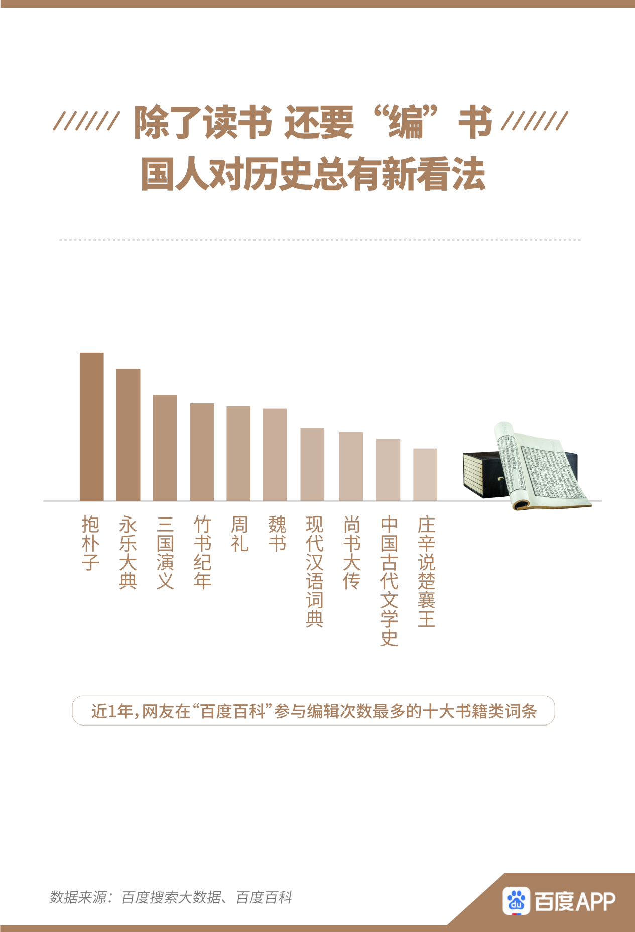 不仅读书,这一届网友还要“编”书。其中,网友对历史著作总有新看法。报告显示,近1年,网友在百度百科参与编辑次数最多的十大书籍类词条,历史著作占7席。《永乐大典》在600年后仍旧“编辑”不停。