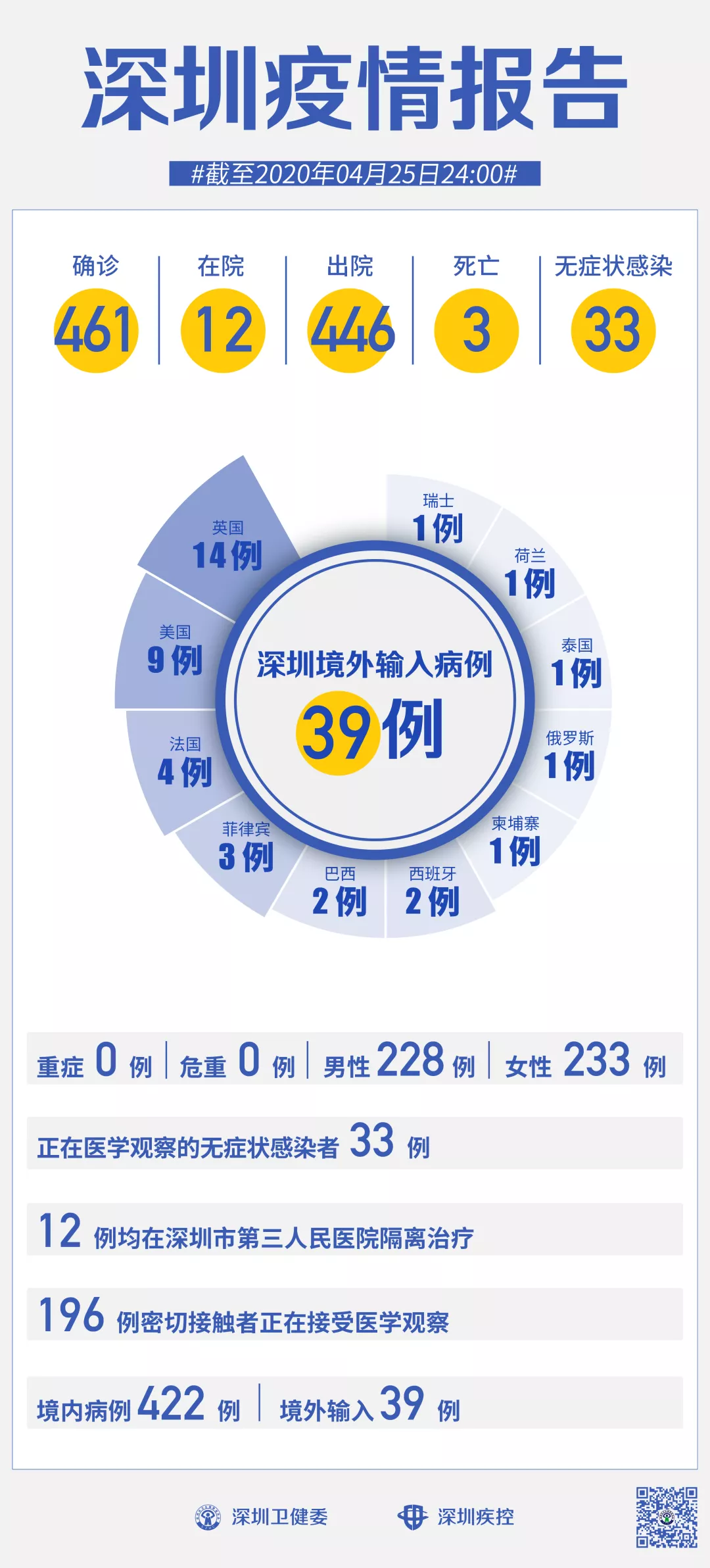 截至4月25日24时,深圳累计报告新冠肺炎病例461例。