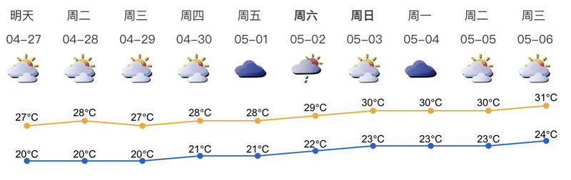 市气象局预计,深圳未来一周天气较平稳,气温逐日上升:周一至周三(27-30日)阳光增多,气温回升,温暖干燥,周五至周日(5月1-3日)多云间阴天,早晚有轻雾,间中有分散阵雨。