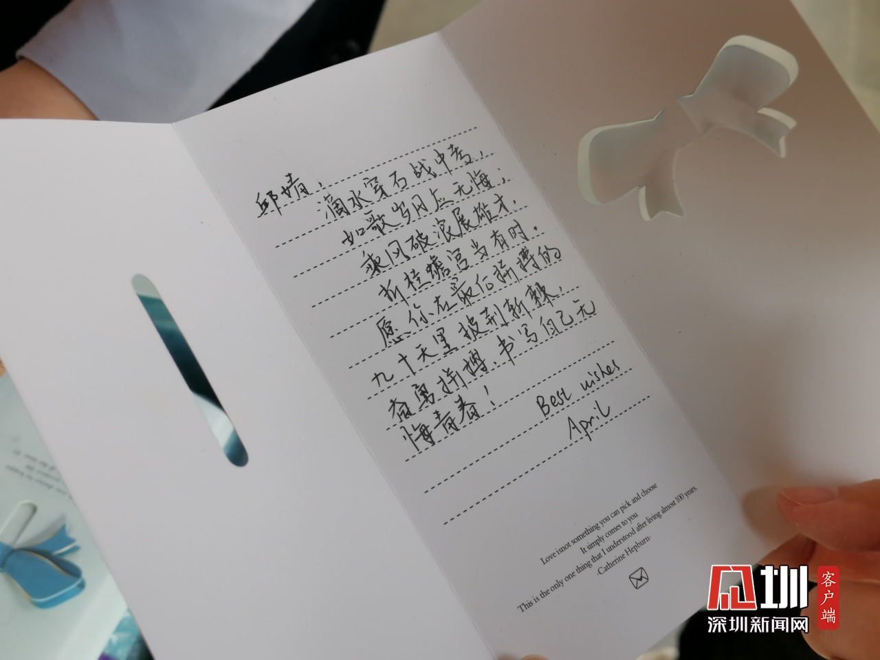 龙华区外国语学校邱婧同学收到老师祝福卡(郑瑞欣 摄)