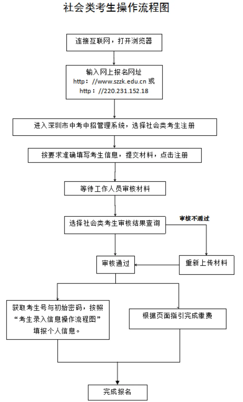 见圳客户端·深圳新闻网2020年4月30日讯 据深圳市教育局消息,2020年深圳高中阶段学校招生考试(以下简称“中考”)报名定于5月6日-15日进行,考试时间为7月20日-21日。 今年本市应届初中毕业生仍继续在就读学校集体办理报名手续。符合深圳中考报名条件的深圳户籍往届生、在市外就读的深圳户籍应届初中毕业生(以下简称“社会类考生”)采用网上报名方式进行报名。 报名条件 一、具有我市户籍的初中毕业生,可以在我市报名参加中考。 二、具有我市初三学籍的随迁子女可以报名参加中考,同时符合以下条件的,可以参加相应的公办普高、民办普高和中职学校的划线录取。 (一)父亲或母亲在我市具有合法稳定职业; (二)父亲或母亲在我市具有合法稳定住所; (三)父亲或母亲持有有效《深圳经济特区居住证》; (四)父亲或母亲在我市缴纳基本养老保险及基本医疗保险,且至少其中一个险种累计缴费满3年,社保累计年限计算截至2020年8月31日; (五)随迁子女在我市具有3年完整初中学籍。 不符合上述条件但具有我市初中学籍的随迁子女,可以在我市参加中考,但仅限于参加民办普高补录或中职学校注册入学。 三、高中阶段学校在校生不得报名。 本市应届初中毕业生报名办法 本市应届初中毕业生于5月6日至7日在就读学校集体办理报名手续。 今年中考继续实行网上报名。要求各学校开放计算机房,为本校考生上网报名提供方便。 5月8日至15日,学校组织考生进行电子摄像,学校和考生分别上网录入报名信息,考生录入信息可参考“考生录入信息流程图”进行操作。 市教育局强调,学校不得以任何理由拒绝有本校学籍的应届毕业生报考(参加中职学校自主招生、注册入学的考生,也须报名参加中考)。如有违反者,将严肃查处,并追究相关人员责任。同时要求各区有关职能部门、各有关学校(报名点)要严格审查报名材料。对不符合报名条件、弄虚作假而被录取的考生,一经发现,取消其录取资格;已经到录取学校报到注册的,取消其学籍,并追究相关人员责任。 社会类考生报名办法 社会类考生采用网上报名方式进行报名。报名考生需在5月6日至15日登录报名网址(http://www.szzk.edu.cn/),按照提示进行网上注册,上传报名审核资料,由考生户籍所在区社会报名点进行线上审核,审核通过后系统将生成中考考生号及初始密码,考生需用获取的考号及密码登录中考中招管理系统,填写个人信息,具体操作可参考“考生录入信息流程图”。同时需在报名截止前根据指引完成网上缴费。 若考生网上报名审核不通过,需按照系统的不通过原因提示,重新补充审核资料,如多次上传资料失败或审核不通过,考生可拨打户籍所在区的社会报名点电话进行咨询或电话预约,按照工作人员指示进行操作报名,不要在未预约的情况下前往社会报名点,尽量避免出行,减少人员聚集。 社会类考生操作流程如下图: