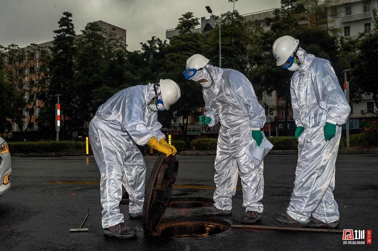 福田分公司巡查工张忆浩、吴晖雄和罗宝斌,正对福中路的排水管网进行细致排查。身后的乌云,与他们白色的防护服形成鲜明对比。