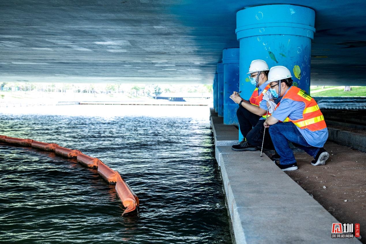 南山分公司工程师李香弟和黄港龙,正检查中心河河口水质情况。