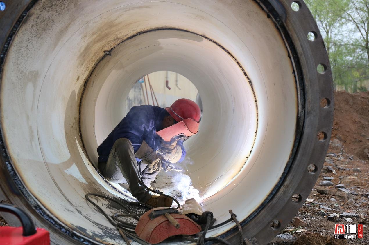 焦作水务公司电焊工申强,正对府城水厂配套新城加压站 DN1200管道进行工艺焊接。