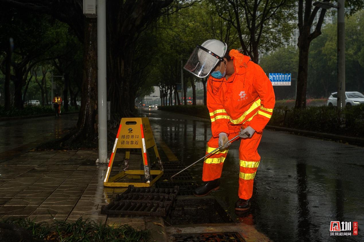福田分公司员工殷海峰,正打开雨水篦子加速排水。