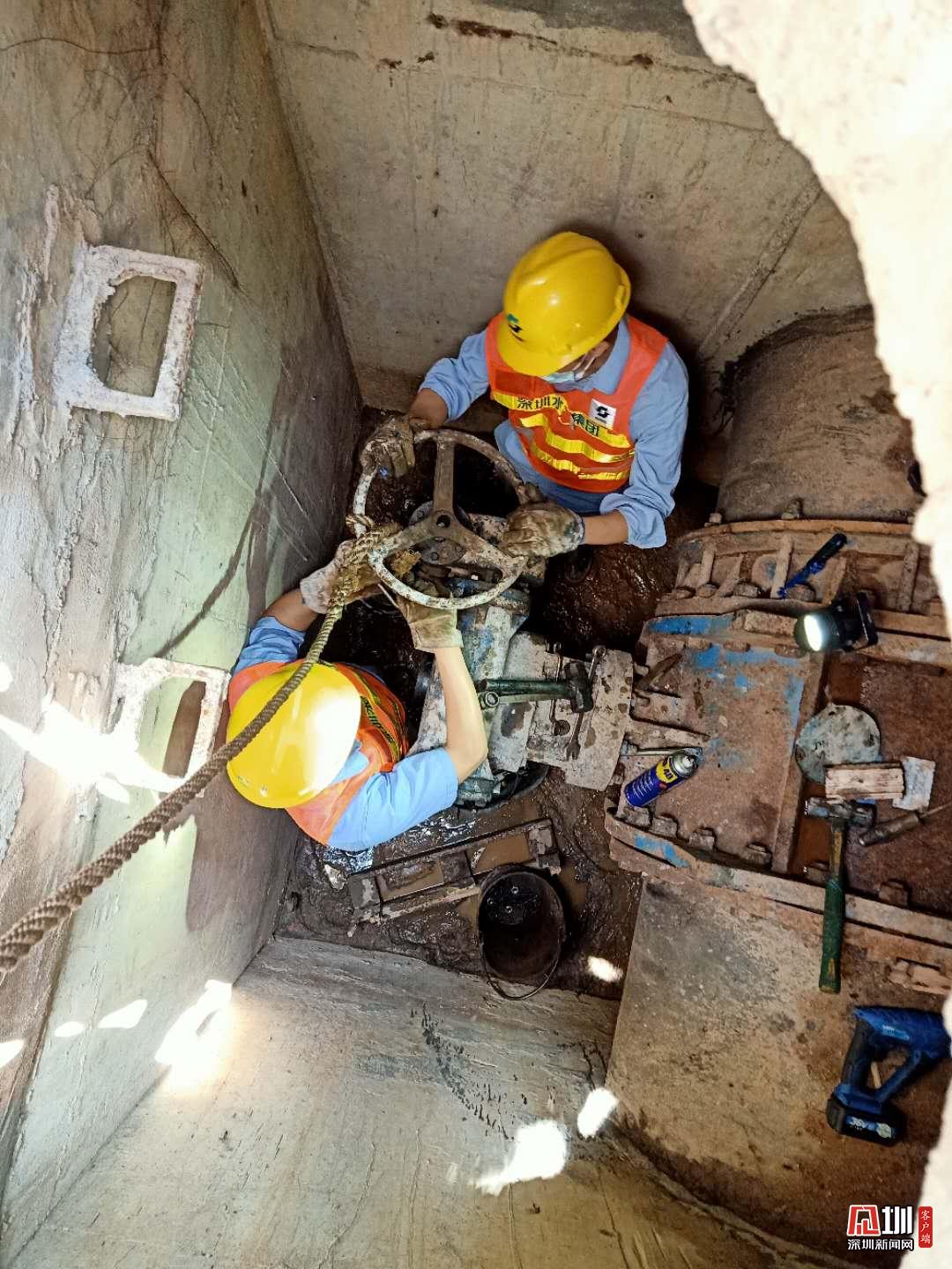 阀门检测及维修分公司维修工何水怀和黄伯良,正紧急更换阀门。