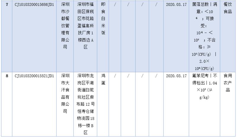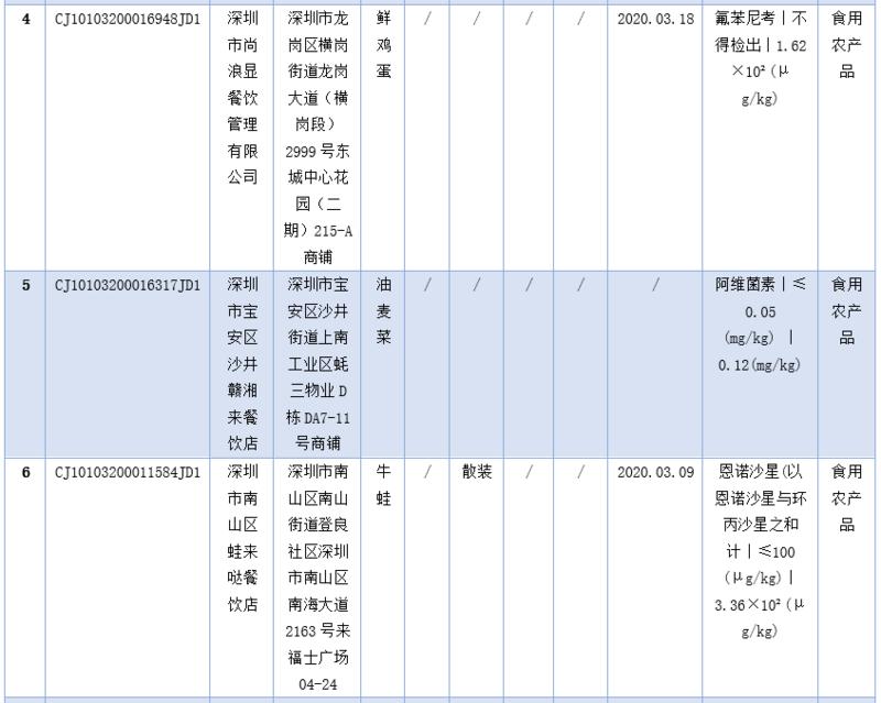 见圳客户端·深圳新闻网2020年5月1日讯(深圳特区报记者 杨德琦)4月30日,深圳市市场监督管理局发布第十四期食品安全抽样检验情况通报,3月共抽检餐饮环节食品1009批次,涉及餐饮环节经营主体919家次,共检测食品指标6347项次。其中不合格样品8批次,涉及不合格食品类别有食用农产品6批次,黄豆芽、萝卜、鸡蛋、油麦菜、牛蛙等在列;餐饮食品1批次,为即食白米饭;食用油、油脂及其制品1批次,为煎炸用油。涉及不合格项目类别为兽药残留、农药残留、非食用物质、微生物污染、品质指标。