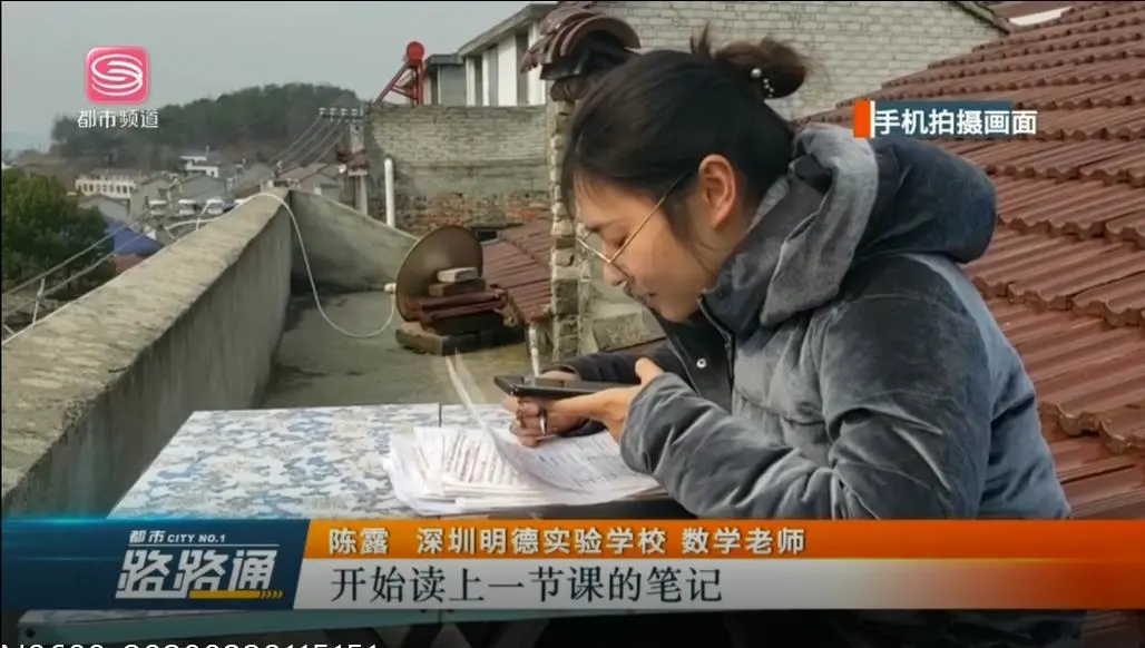 深圳中小学网课开课以来,广大青年教师克服种种不利条件,变身教育主播,让知识穿越屏幕直达学生心灵,深圳明德实验学校的陈露老师就是其中一位典型代表。她因疫情滞留于湖北农村,由于信号差,一开始为了录制微课,白天她就带好口罩跑到杂草丛生的山顶找信号,一块木头当凳子,坐下慢慢等上传视频,顶着寒风一坐就是半天。线上教学正式开课后,由于设备和信号问题,陈老师只能采用QQ直播的方式给学生上课,为了保障语音效果,她把课堂搬到信号稍强的屋顶。上屋顶不是件容易的事,陈老师必须先爬一个陡峭的梯子,再匍匐穿过一个孔洞才能到达。一个天台、一张折叠桌成了她的“三尺讲台”,一叠信纸成了她的“黑板”,一部手机成了她的“多媒体”。陈露老师每天坐在楼顶的寒潮和风雪中,坚持完成直播课,保证学生正常的线上学习。