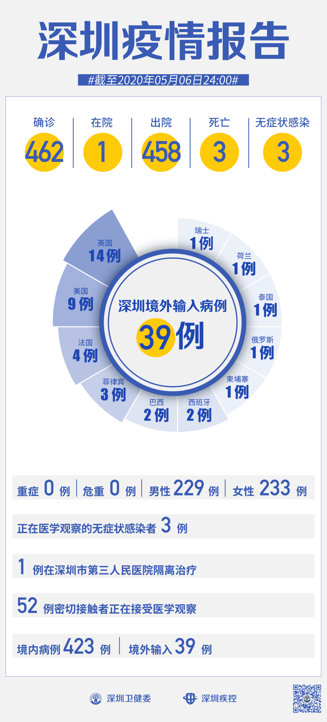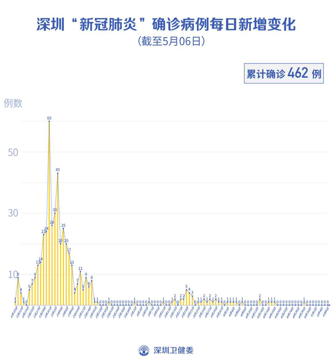 截至5月6日24时,深圳累计报告新冠肺炎病例462例。在院治疗仅有1例。
