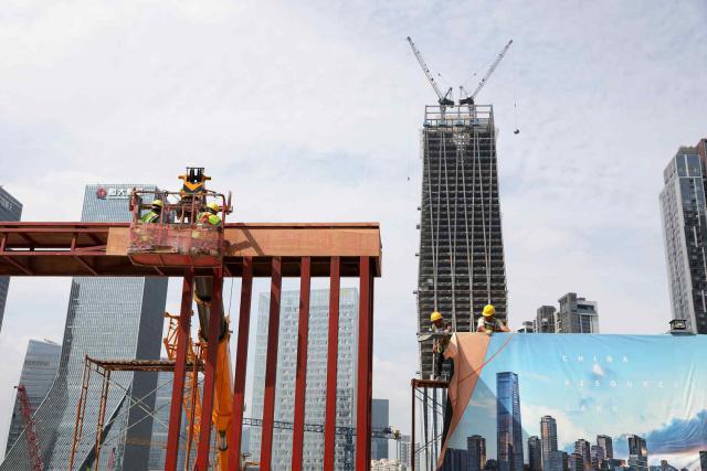 ▲建筑工人在户外顶着烈日工作。