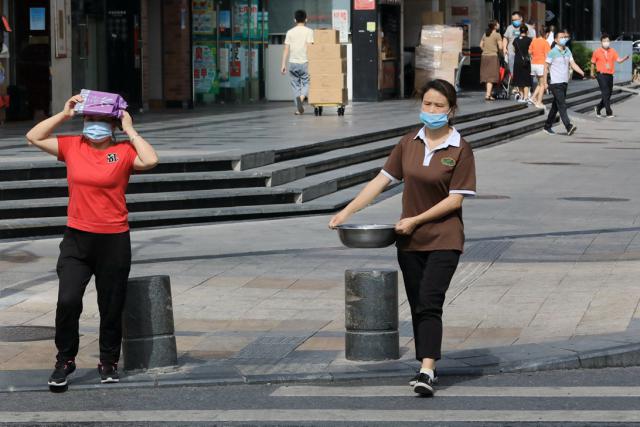 ▲走在街上,热浪扑面而来,耀眼的阳光把人晒得睁不开眼,行人纷纷拿起手头物品遮挡烈日。