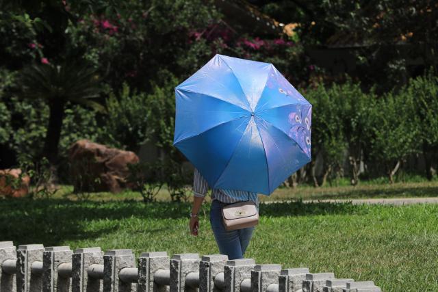 ▲遮阳伞、太阳帽成了市民出行必备之物。