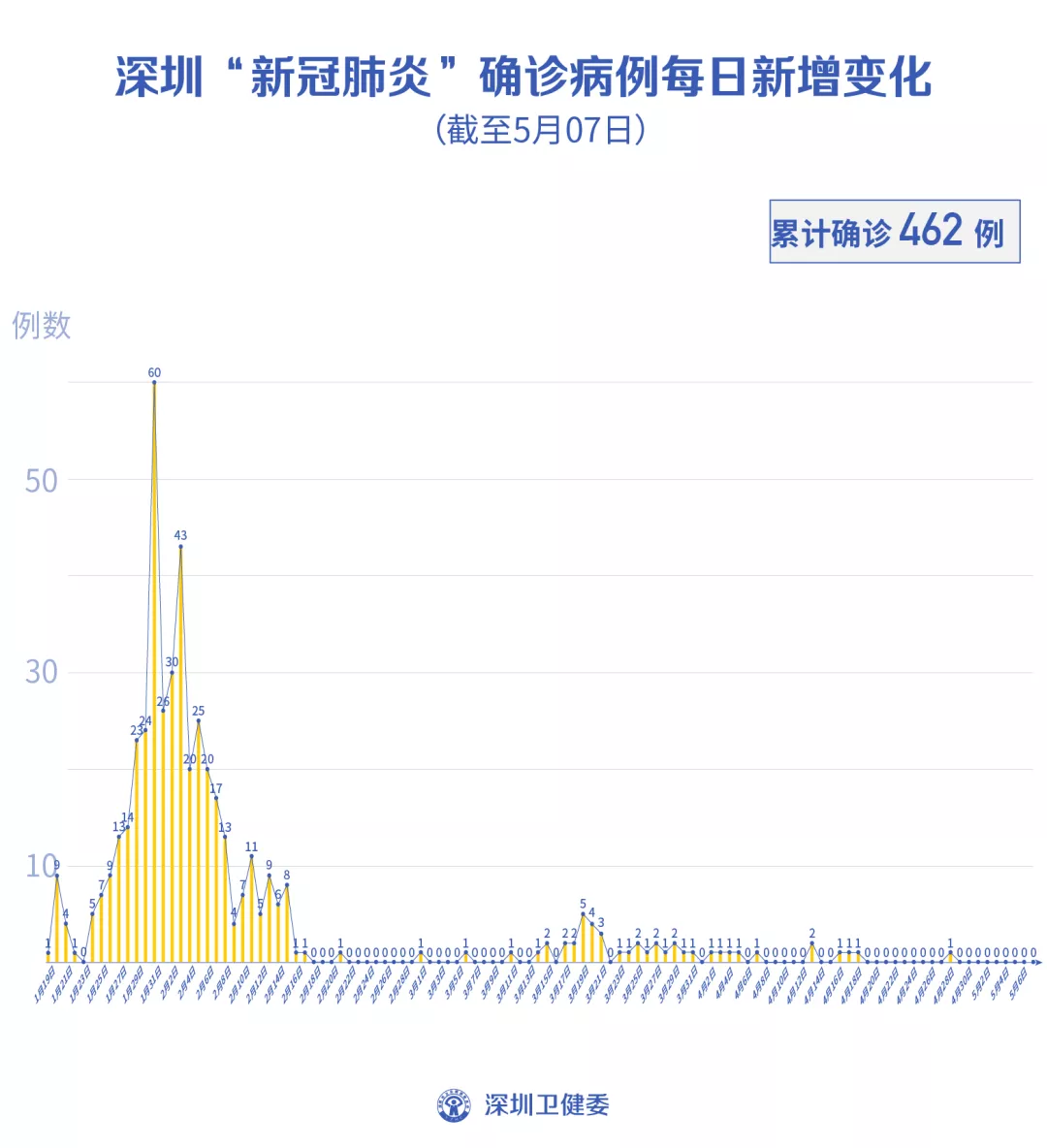 截至5月7日24时,深圳累计报告新冠肺炎病例462例。在院治疗仅有1例。