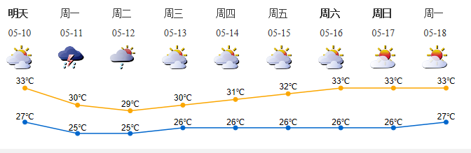 5月9日多云间晴天,局部有短时阵雨,气温27-32℃,中北部和人口密集区33-34℃;
