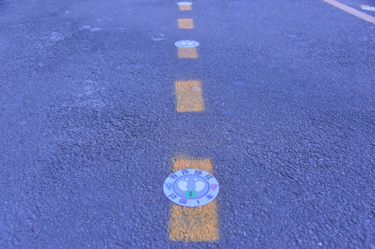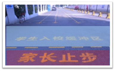 校门口还设置了,入校缓冲区,家长止步区,三色地贴!请家长们止步!孩子们可以循着地贴,走向属于自己的色彩通道!