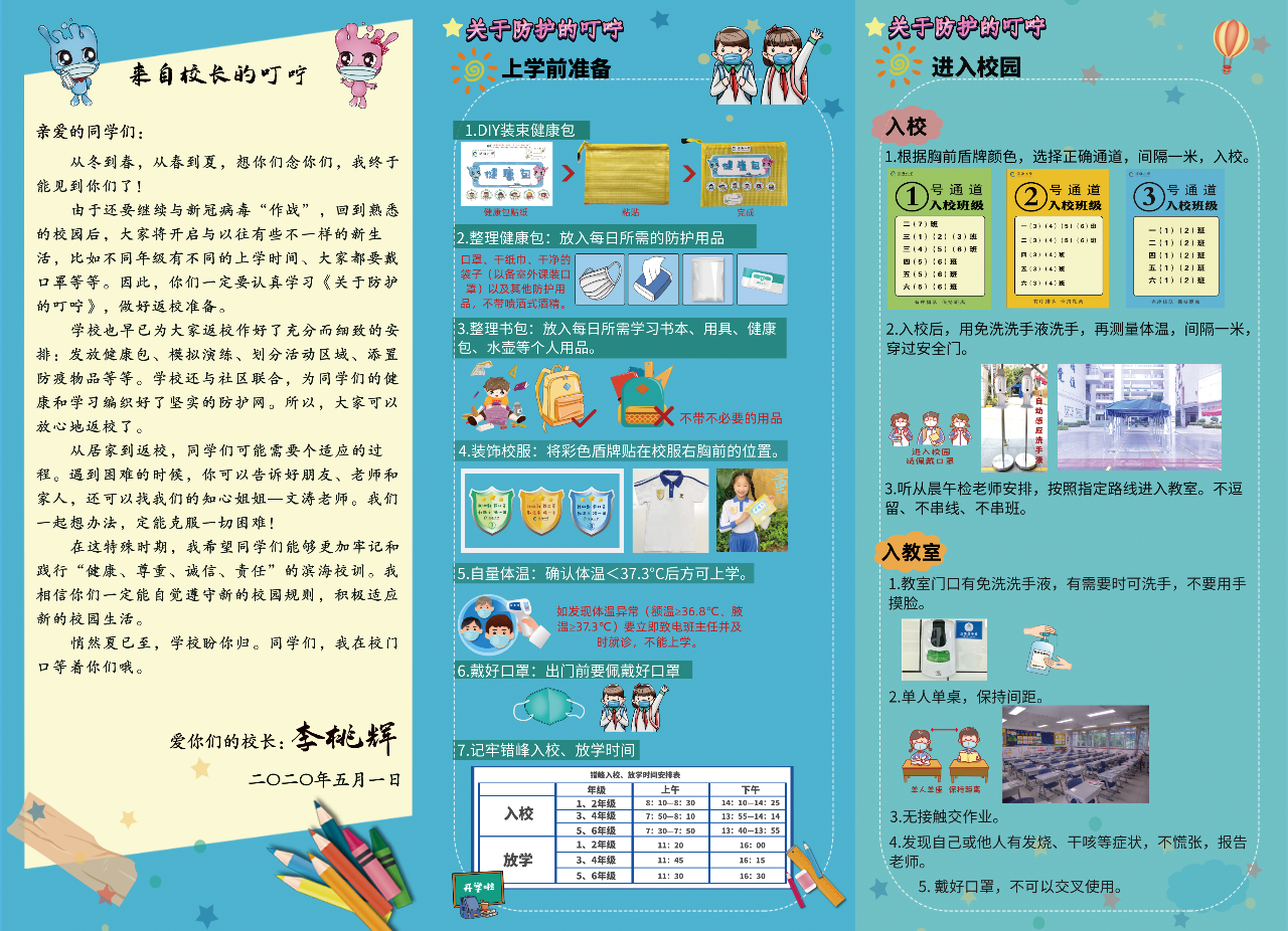 针对即将返校的学生,还有一份特别的《叮咛》,来自李桃辉校长《爱的叮咛》,这里有桃辉校长的暖心留言,还有帮助孩子们适应全然不同的校园新生活的各种说明!