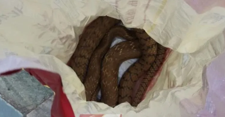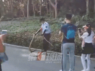 最近,两条体型硕大的蛇突然在莲花山公园人行道旁边的草丛出没,随后,一名公园内的保安人员徒手捕捉了两条蛇。