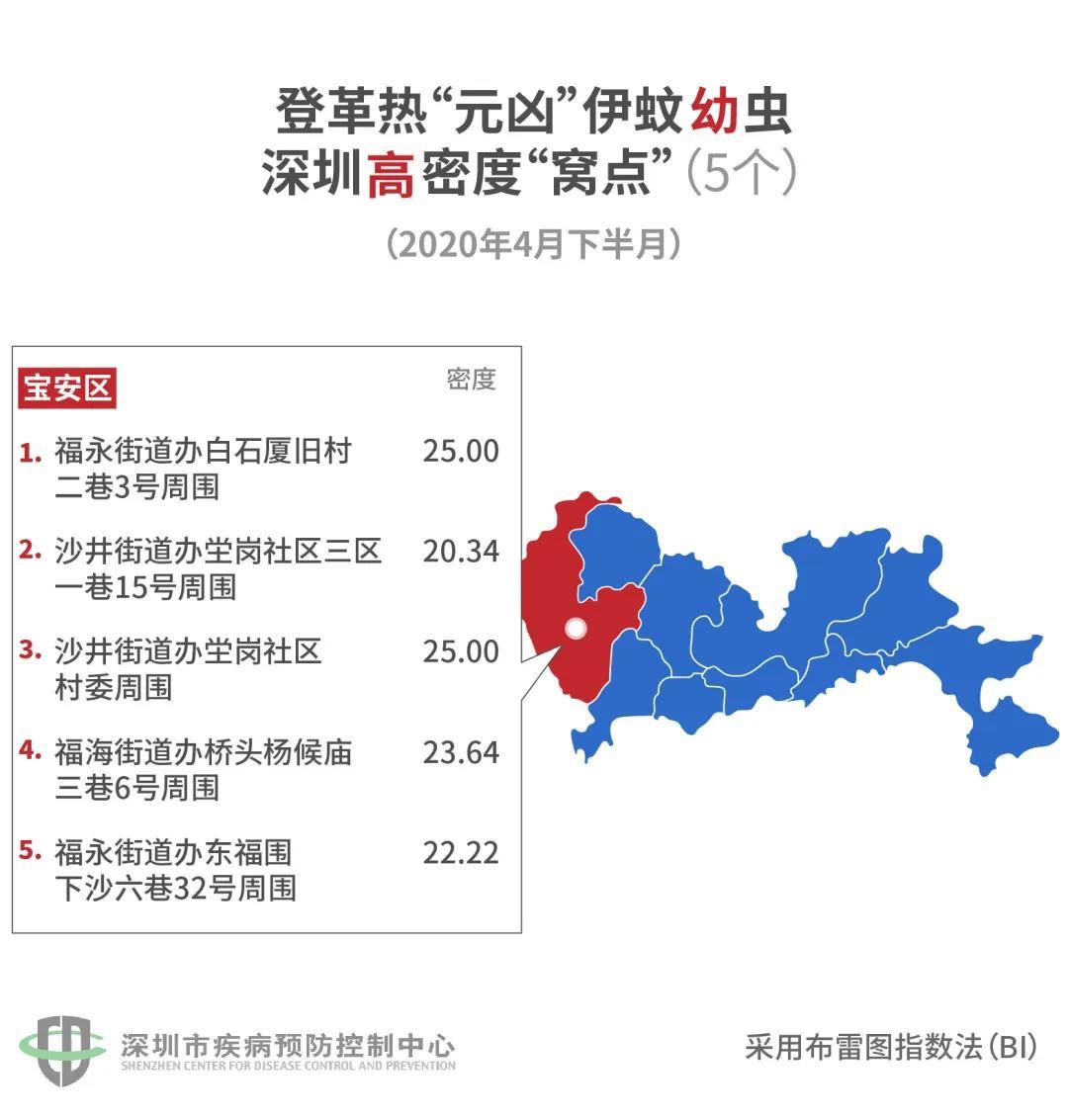 据悉,在全市设置的423个监测点中,不合格的有104个,占24.59%。其中低密度有79个,中密度有20个,高密度有5个。5个“蚊子窝”全在宝安!