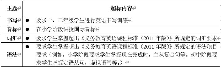 1.培训不得超出现行义务教育英语课程标准规定的各学段分级标准,禁止将初中知识类的教学内容提前至小学教学与测评,禁止将现行普通高中英语课程标准规定的知识类教学内容提前至初中教学与测评。