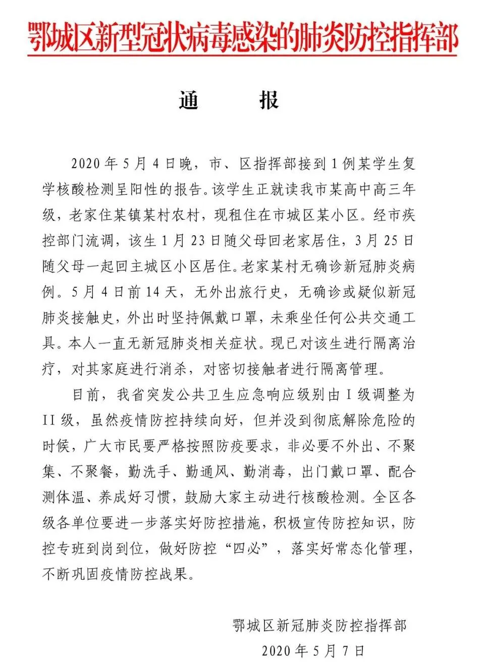 通报称,5月4日晚,市、区指挥部接到1例某学生复学核酸检测呈阳性的报告。该学生正就读鄂州市某高中高三年级,老家住某镇某村农村,现租住在市城区某小区。