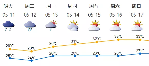 5月11日阴天,气温25-29℃,有阵雨或雷阵雨,伴有短时阵风7级左右。12日有雷阵雨,局部大雨,局部有短时强降雨;13日阵雨转多云;14-17日多云到晴天,天气再趋闷热。