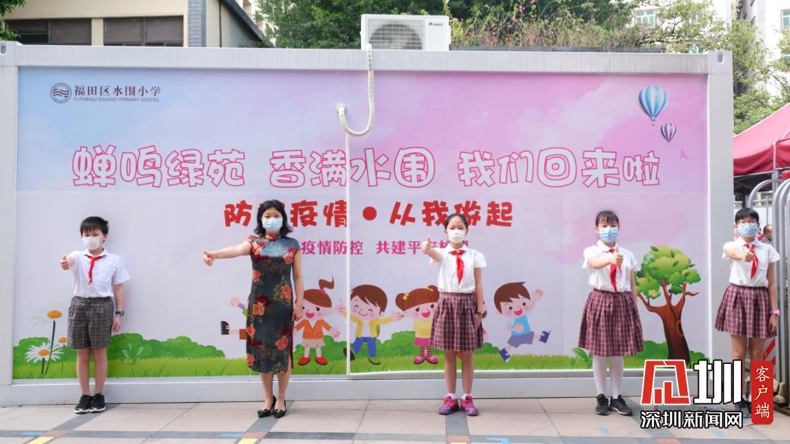 据悉,水围小学“复学典礼”上午8:40正式开始,出席的嘉宾有福田区教科院教研员、少先队总辅导员李楠、卫生健康副校长明昭。各班级的学生则带着口罩,单人单桌在教室内,以观看直播的方式参加典礼。