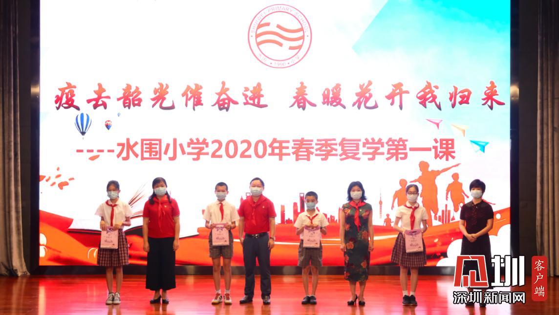 疫情期间,水围小学“停课不停学,停课不停教”,进行了为期三个月的线上教学。在线上学习的这段时间里,学校涌现了一批在德智体美劳各方面表现优异的同学,他们被评为水围小学“红领巾十星”,区教科院李楠、卫生健康副校长明昭、校长刘锐娟、校长李月琴副与副校长杨禹清在此次“复课典礼”中为获奖学生代表颁奖,并在典礼的最后,为在场的学生代表发放了暖心包。