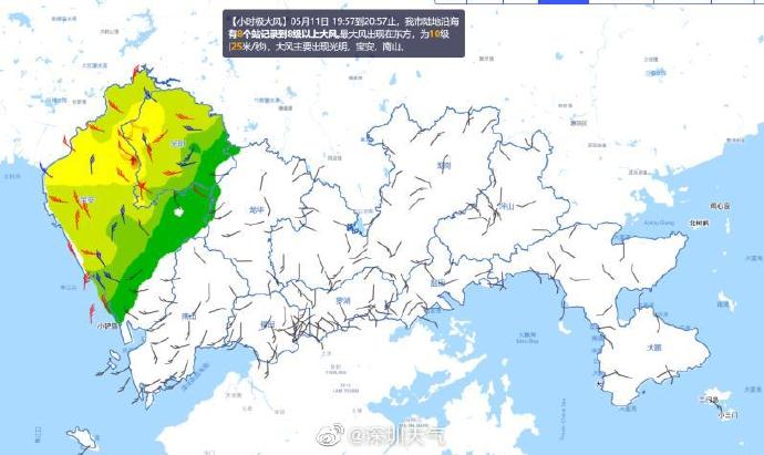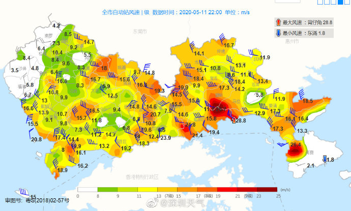 22时18分:过去1小时深圳市最大阵风达到10-11级,出现在盐田和大鹏南澳地区。