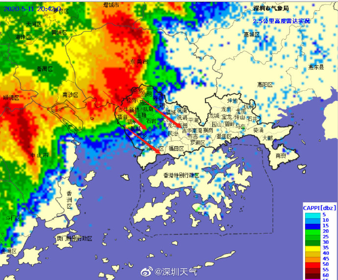 21时49分:目前强雷雨云团已给宝安、光明、龙华、南山、福田等区域带来强雷雨和大风,预计即将影响罗湖、盐田、龙岗、坪山和大鹏,将带来小时雨量30毫米左右的降雨以及8-9级的短时大风,请注意防御。