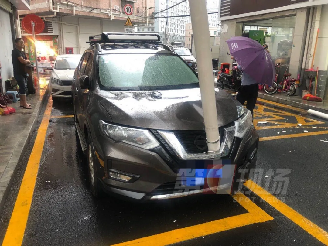 原标题:10米雨水管从天而降,直插小车“头部”,还有床垫、储水箱...