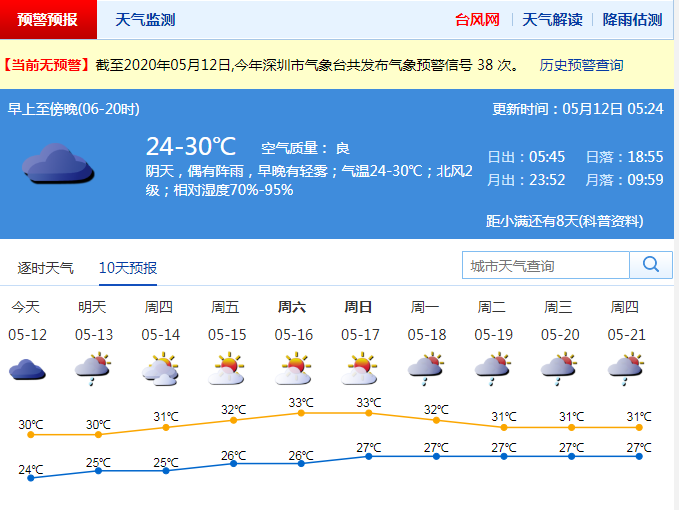 见圳客户端·深圳新闻网2020年5月12日讯 深圳昨夜雷电+大风黄色+暴雨黄色预警齐生效,市气象台于2020年05月11日23时30分在全市取消暴雨黄色、大风黄色预警。预计12日白天多云间阴天,有阵雨。13日阵雨转多云,天况逐渐转好,14-17日多云为主,阳光充足,天气再趋炎热。