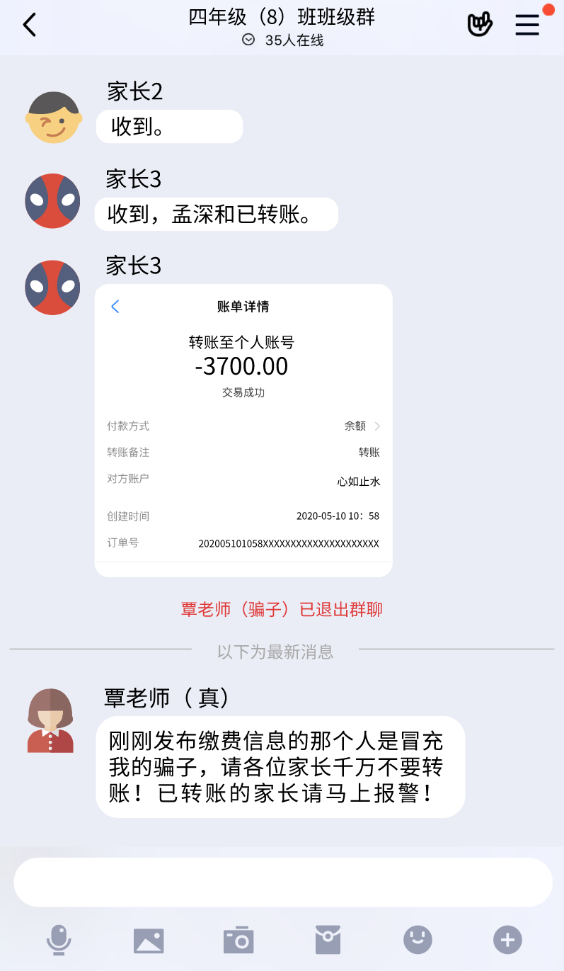 骗子在收款后立即退群,等真老师上线后,被骗父母醒悟过来后,骗子已经逃之夭夭。