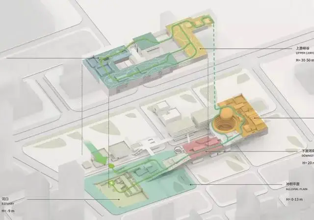 产业生态雨林的三个层级都可经由一个城市公园的多层级通道系统抵达,仿佛曲折蜿蜒的河水流过缓坡。