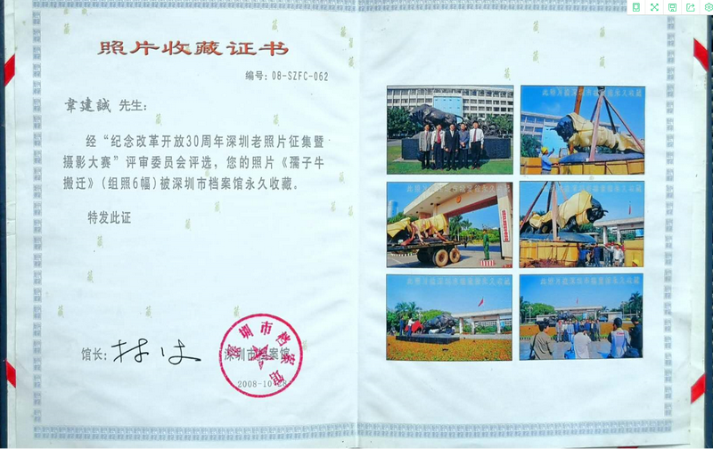 韦建诚拍摄的《孺子牛搬迁》组照被深圳市档案馆永久收藏。(摄影:韦建诚)