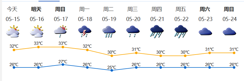 我市多云间晴天,局部有短时(雷)阵雨;气温26-32℃;东南风2-3级;相对湿度60%-90%。