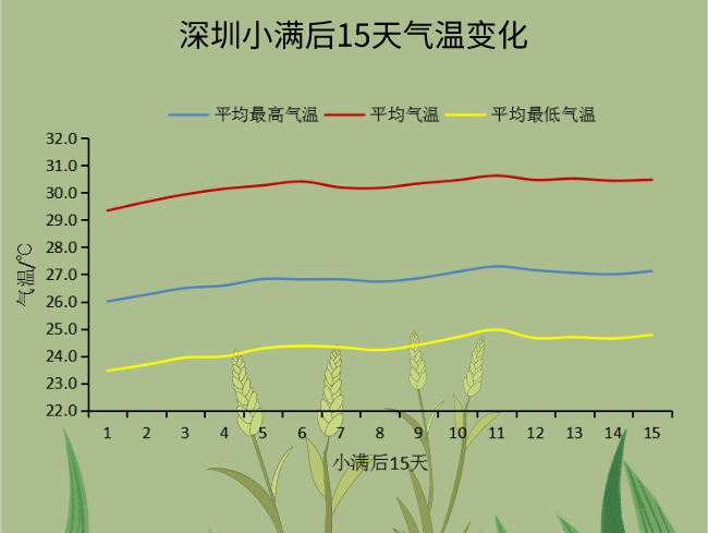 小满后15天,深圳的平均气温为26.8℃,平均最高气温为30.2℃,出现33.0℃及以上的炎热天气平均有1.5天。尽管小满时节的深圳还处在初夏,但给人的感觉已经是盛夏了。历史上小满后15天深圳共出现10天的高温天气(最高气温≥35℃),其中1963年和2000年曾连续出现2天的高温天气。