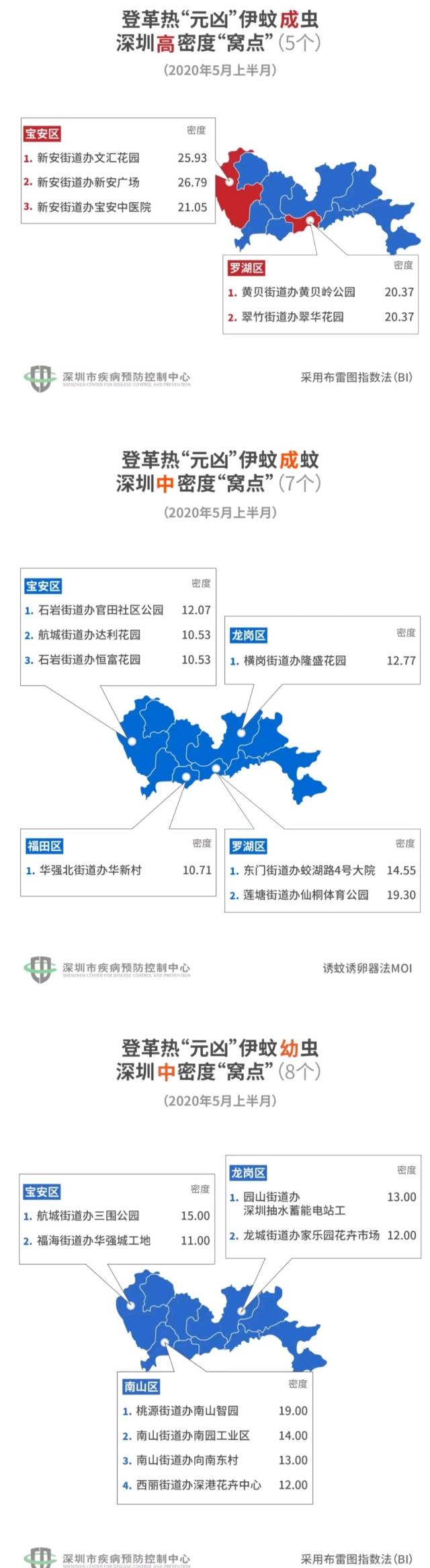 5月18日,深圳市疾控中心发布了5月上半月(5月1日-15日)的全市伊蚊密度监测结果,高、中密度的20个“窝点”里,有8个是居民小区,其余多为公园、工地,还有1个是医院。