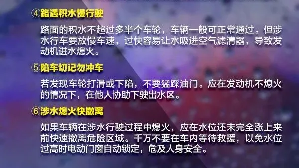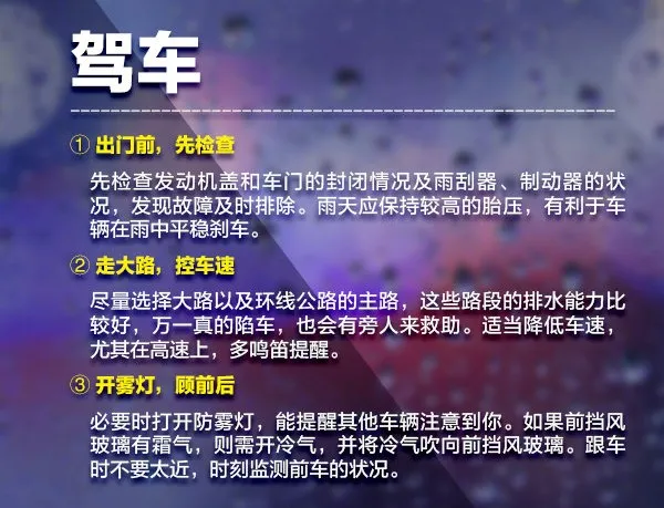 √雨天路滑,注意车辆行驶安全,控制车速防止追尾等事故的发生,绕开积水隧道涵洞和城市低洼区域,防止跌入窨井、地坑,不要在深水区逗留。