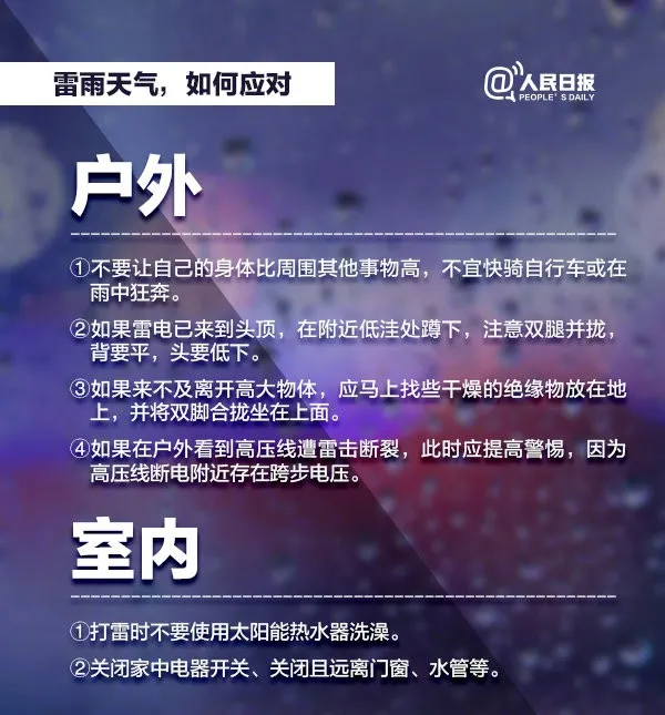 √雷雨天气容易发生泥石流、山体滑坡,如在野外,请不要在室外逗留,尽快远离危险的地方。