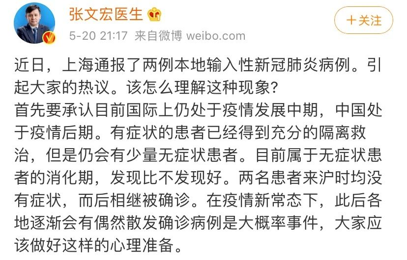 近日,上海通报了两例本地输入性新冠肺炎病例。20日晚间,上海新冠肺炎医疗救治组组长、复旦大学附属华山医院感染科主任张文宏发布微博称,两名患者来沪时均没有症状,而后相继被确诊。