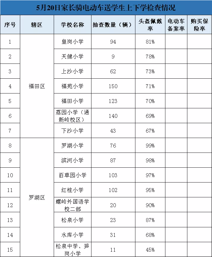 5月20日,深圳交警在全市范围内选取了70所学校进行抽查,共5037辆电动车被查,头盔佩戴率达89%。其中松泉中学、笋岗小学、西丽学校、福华学校头盔佩戴率不足一半。