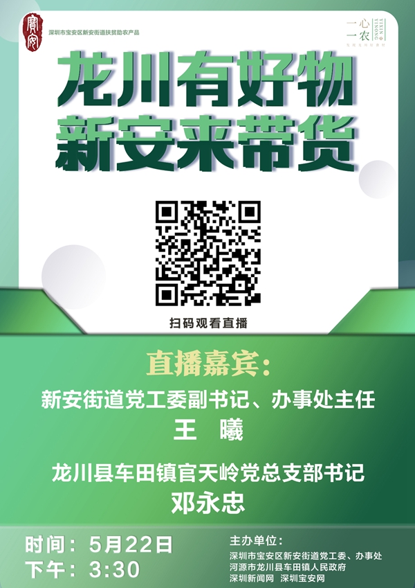 5月22日下午3:30,新安街道党工委副书记、办事处主任王曦、龙川县车田镇官天岭村支部书记邓永忠还将作客深圳新闻网直播间,向网友推介绿壳鸡蛋、黑豆腐竹、生态米、牛海花生等优质农产品,通过电商打通贫困村农产品销售渠道。欢迎观看,不见不散!