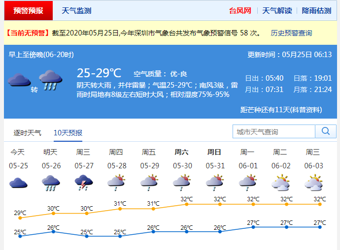 见圳客户端·深圳新闻网2020年5月25日讯 连续阴雨雷暴,上周末的天气趋于平静,但是,新一波“龙舟水”马上到货!据深圳气象台消息,25-26日深圳有大雨到暴雨,并伴有雷暴和8级左右短时大风,降雨主要出现在25日中午至26日上午,26日午后降雨减弱;27-30日仍有阵雨或雷阵雨。