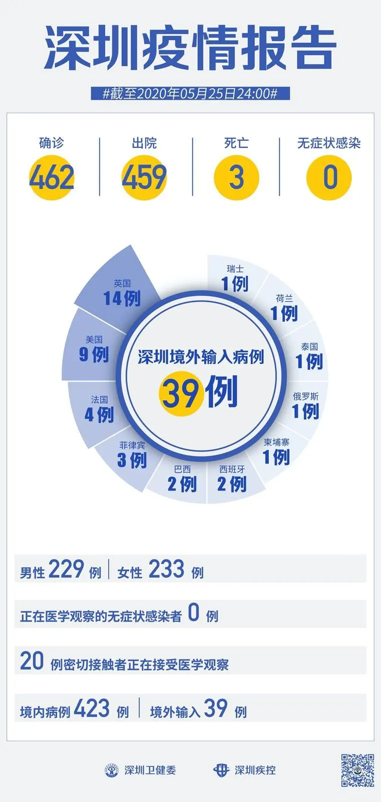 截至5月25日24时,深圳累计报告新冠肺炎病例462例。