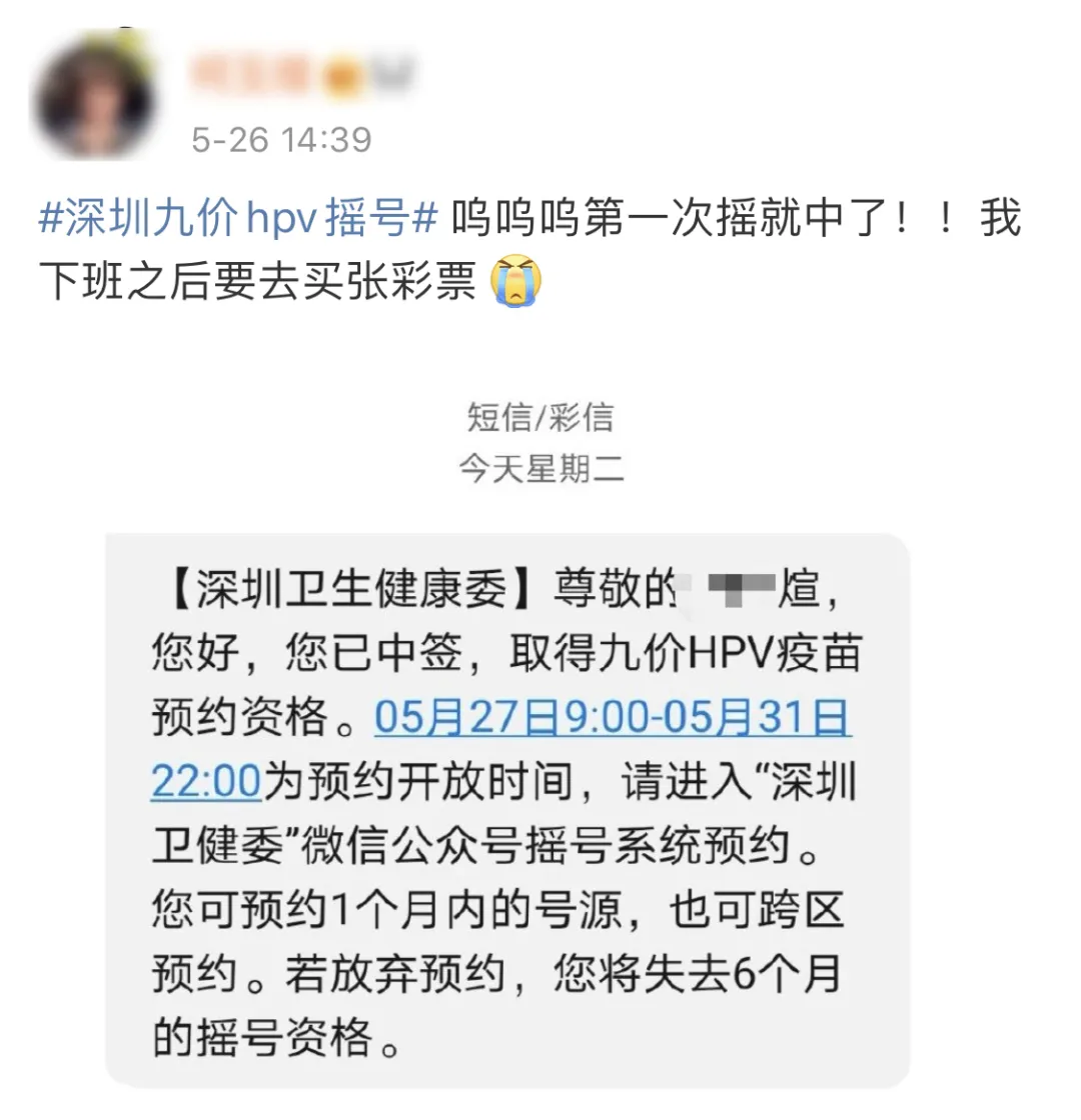 “呜呜呜……简直不敢相信我的眼睛,前段时间连口罩都抽不中的我,竟然抽中了九价HPV疫苗”。