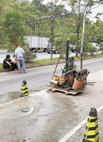 2020年5月1日,执法支队龙岗大队执法人员在辖区内值班巡查时,接到投诉称爱南路上海外国语学校门口有道路施工人员钻探时钻破水管,现场水流满地,请求执法人员前往调查。