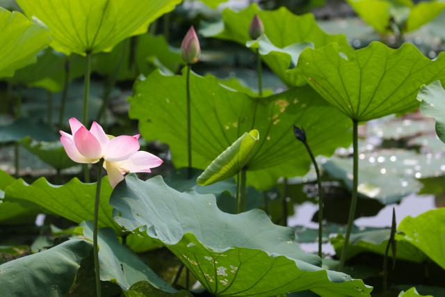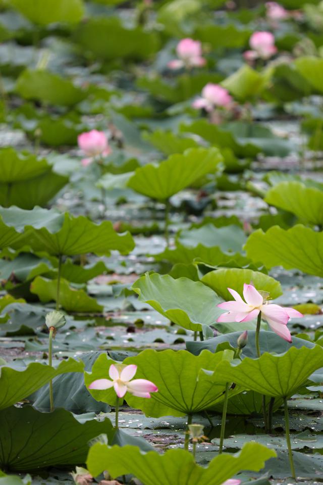 ▲公园内主要荷花品种有粉色的"红建莲"和白色的"一丈青","红建莲"已大量盛开。