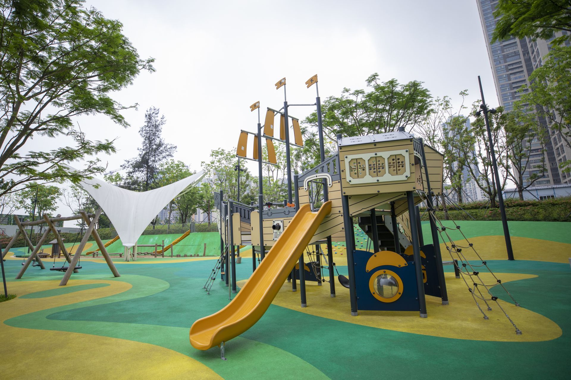 28日,记者从万象天地旁的沙河西路进入位于大沙河生态长廊中的大冲公园,这里设置了专门的儿童游乐区,有三处长短不一的趣味滑梯、沙池、海盗船、攀爬墙等设施。